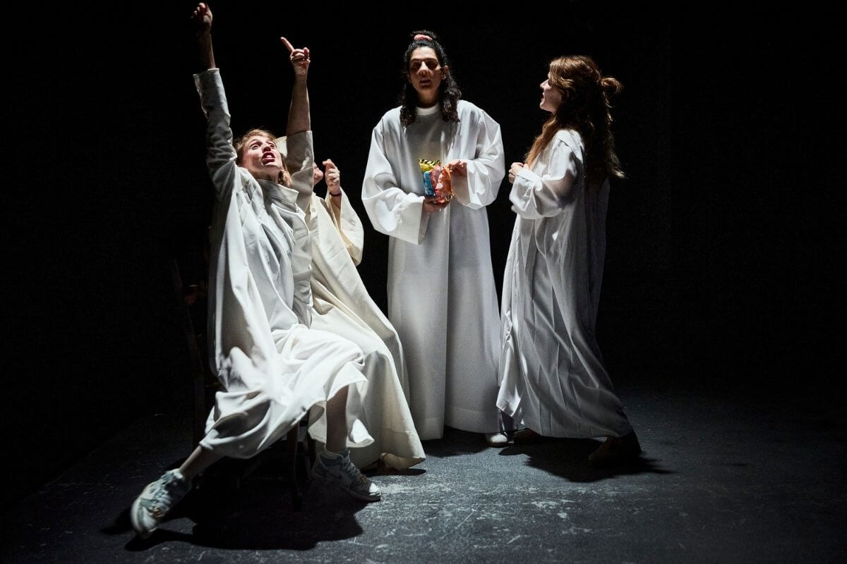 Avec Hautes Perchées, Maurin Ollès invoque le regard de quatre femmes. Il met en lumière les réalités des structures de soins et les mécanismes répressifs de la justice. Il souligne aussi la difficulté d’étudier ces questions dans un cadre académique. Dans une ville non nommée, nous suivons quatre femmes. Une serveuse en restauration, une directrice de structure d’accueil, une juge d’application des peines et une universitaire. Leurs récits intimes sont une ode pour ces femmes qui luttent contre un système qui les stigmatise. La musique qui les accompagne révèle leur intimité tout en mettant à distance leur réel, dans un bouillonnement rythmé, étrange et joyeux.